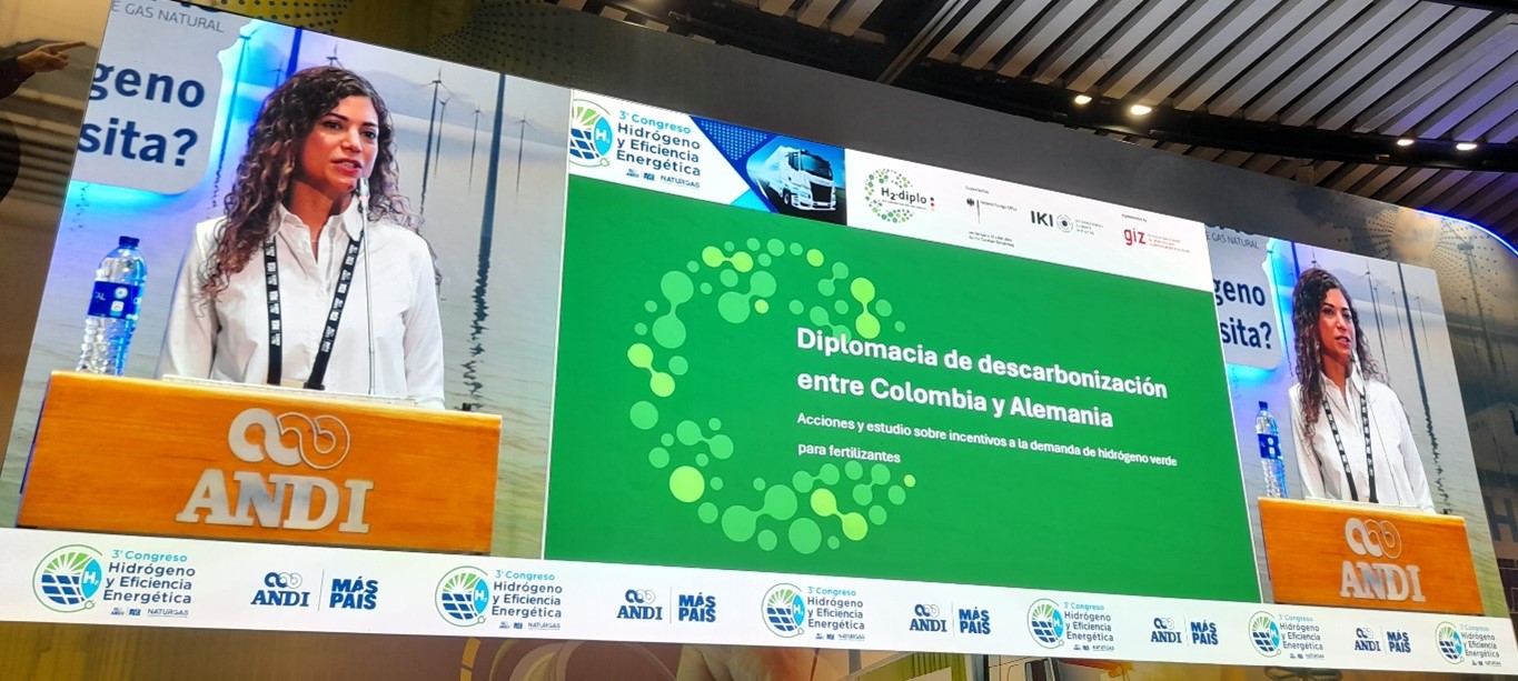 La tercera versión del Congreso de Hidrógeno y Eficiencia Energética en Cartagena abordó los avances, retos y oportunidades del uso y producción del hidrógeno verde en la transición energética del país y región. Durante el congreso, Gina Lagunes, responsable de implementación del programa H2-diplo Diplomacia de Descarbonización, presentó la ponencia Diplomacia de Descarbonización Colombia y Alemania: Acciones y estudio sobre incentivos a la demanda de hidrógeno para fertilizantes. En su intervención destacó el apoyo que la GIZ ha brindado a Colombia desde 2021 para la implementación de la Hoja de Ruta del Hidrógeno, así como la creación de la plataforma Ecosistema H2 Colombia, en colaboración con el Ministerio de Minas y Energía.